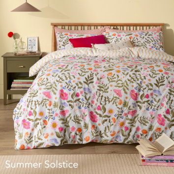 Refresh your bedding collection with our new duvet cover sets, crafted from easy-care, quick-drying fabrics that don’t require ironing. The Summer Solstice set offers a whimsical take on design, featuring floral and celestial motifs, with a playful wiggle stripe on the reverse. For a bolder look, the Ana Stripe set provides colourful geometrics on one side and classic stripes on the other. The Wiggle Scallop set adds charm with its versatile plain contrast face and reverse scalloped edge. For an eye-catching, fantasy design theme, the Seraphine set features hand-painted mythical creatures and celestial motifs, complemented by a simpler reverse.