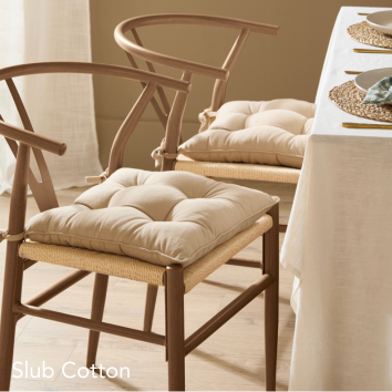 Our bestselling Bertie cushion comes in two new shades, chocolate and mauve, adding softened colour to a familiar favourite. We’re also introducing the much-loved Truro striped cushion in three new colourways, finished with classic narrow stripes and a gentle mini Oxford border. Inspired by the natural world, the Pebble cushion brings touch-worthy chenille texture, while new Slub Cotton seat pads, available in four natural tones, offer simple comfort and an easy, lived-in look around the table.