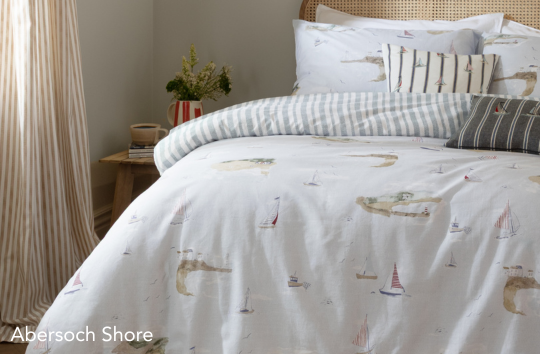 Discover the latest additions to our bedding collection, including the elegant Olivia set, which showcases a hand-painted floral trellis complemented by a vine stripe reverse. We also introduce Abersoch Shore, a design inspired by coastal landscapes, featuring charming painted sailboats and classic nautical stripes. To complete the collection, the Beachwood throw offers a woven striped design with a stylish fringe trim, available in four distinct colourways. For versatile outdoor living, the Wisley woven outdoor throw presents a delicate herringbone pattern finished with tasselled edges.